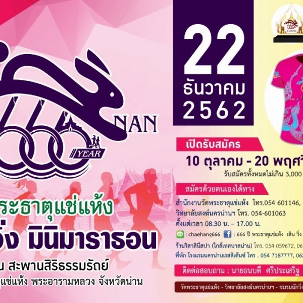 หลักการและเหตุผล ด้วยวัดพระธาตุแช่แห้ง พระอารามหลวง ตั้งอยู่เลขที่ ๘๓ หมู่ ๓ ตำบลม่วงตึ๊ด อำเภอภูเพียง จังหวัดน่าน เป็นสถานที่ประดิษฐานขององค์พระมหาธาตุเจ้าภูเพียงแช่แห้ง ซึ่งเป็นองค์พระมหาเจดีย์ เป็นโบราณสถานที่สำคัญคู่บ้านคู่เมืองน่านมาแต่ช้านาน ในโบราณตามกาลประเพณีถือว่าเป็นพระมหาธาตุ ๑ ใน ๑๒ นักษัตร ตรงกับปีเถาะหรือปีกระต่าย ตามหลักฐานในหนังสือราชวงษ์ปกรณ์พงษาวดารเมืองน่าน ได้จารึกชื่อว่า พระมหาธาตุเจ้าภูเพียงแช่แห้ง นับแต่เจ้าพญาการเมืององค์ปฐมเจ้าผู้ครองนครเวียงวรนครได้อัญเชิญพระบรมสารีริกธาตุและพระพิมพ์เงินพิมพ์คำ จากกรุงสุโขทัย มาประดิษฐาน และย้ายเมืองจากเมืองวรนคร มาตั้งอยู่บนดอยภูเพียงแห่งนี้และทรงยังทะนุบำรุงพระศาสนาให้รุ่งเรืองซึ่งยังคงสืบทอดเป็นมรดกอารยธรรมอันล้ำค่านับอายุกาลมาจนถึงปัจจุบันนี้ มีอายุกาลได้ ๖๖๖ ปี (พ.ศ.๑๘๙๖ – ๒๕๖๒) นำมาซึ่งความภาคภูมิใจความเป็นน่านมาจนทุกวันนี้ ดังนั้น ทางคณะกรรมการพัฒนาวัดพระธาตุแช่แห้ง จึงได้มีดำริจัดงาน ๖๖๖ ปี สมโภชพระมหาธาตุเจ้าเวียงภูเพียงแช่แห้งขึ้นในปีพุทธศักราช ๒๕๖๒ โดยกำหนดให้มีการจัดกิจกรรม ๖๖๖ ปี แช่แห้ง เดิน-วิ่ง มินิมาราธอน ขึ้น เพื่อรณรงค์ให้ประชาชนคนไทยออกกำลังกายเพื่อสุขภาพด้วยการ เดิน-วิ่ง และเป็นการประชาสัมพันธ์เวียงภูเพียงแช่แห้ง เนื่องในอายุกาลครบ ๖๖๖ ปี วัตถุประสงค์ 1. เพื่อเป็นกิจกรรมเฉลิมฉลอง ๖๖๖ ปี เวียงภูเพียงแช่แห้ง 2. เพื่อเป็นการประชาสัมพันธ์การท่องเที่ยวของจังหวัดน่าน ให้นักท่องเที่ยวจากทั่วโลกได้มาเคารพสักการะองค์พระมหาธาตุเจ้าภูเพียงแช่แห้งเพื่อความเป็นมงคลแก่ชีวิต 3. เพื่อส่งเสริมสุขภาพที่ดีแก่เยาวชน นักเรียน นักศึกษาและประชาชนในการออกกำลังกายได้อย่างถูกวิธีและเหมาะสมกับสุขภาพของเรา ประเภทการแข่งขัน โดยแบ่งเป็น 3 ประเภทได้แก่ 1. เดิน วิ่งเพื่อสุขภาพ (Fun run) 5 กิโลเมตร เพศชาย ค่าสมัคร 400 บาท จัดให้มีการแข่งขันรายการ ดังนี้ 1. รุ่นประชาชนทั่วไปที่มีอายุไม่เกิน 15 ปี มี 3 รางวัล 2. รุ่นประชาชนทั่วไปที่มีอายุตั้งแต่ 16 – 19 ปี มี 3 รางวัล 3. รุ่นประชาชนทั่วไปที่มีอายุตั้งแต่ 20 – 29 ปี มี 3 รางวัล 4. รุ่นประชาชนทั่วไปที่มีอายุตั้งแต่ 30 – 39 ปี มี 3 รางวัล 5. รุ่นประชาชนทั่วไปที่มีอายุตั้งแต่ 40 – 49 ปี มี 3 รางวัล 6. รุ่นประชาชนทั่วไปที่มีอายุตั้งแต่ 50 – 59 ปี มี 3 รางวัล 7. รุ่นประชาชนทั่วไปที่มีอายุตั้งแต่ 60 ปี ขึ้นไป มี 3 รางวัล 2. เดิน วิ่งเพื่อสุขภาพ (Fun run) 5 กิโลเมตร เพศหญิง ค่าสมัคร 400 บาท จัดให้มีการแข่งขันรายการ ดังนี้ 1. รุ่นประชาชนทั